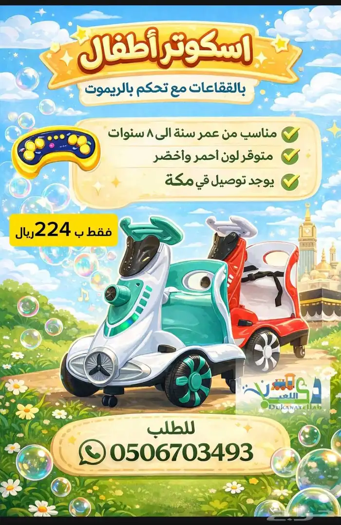 اسكوترات اطفال كهربائي مع تحكم بالريموت جديد بكراتينه نوفر لكم حسب الطلب يوجد توصيل مكة وجدة ويوجد استلام من الموقع حي الشوقية بمكة للطلب على الرقم الموضح في الصورة