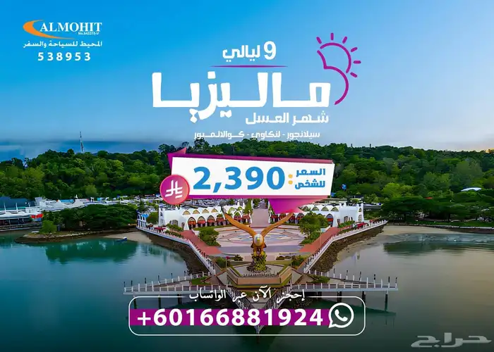 المدة: 9 ليالٍ. السعر: يبدأ من 2390 ريال سعودي للشخص الواحد. الفندق والإقامة: سيلانجور: فندق صنواي لاجون- الإقامة لمدة ليلتين - غرفة ديلوكس بلس جزيرة لنكاوي: فندق وشقق دايانج لنكاوي- الإقامة لمدة 3 ليالي – غرفة ديلوكس كوالالمبور: فندق إيبيس كوالالمبور سيتي سنتر– الإقامة لمدة 4 ليالي – غرفة ستاندرد مزايا إضافية: وجبة إفطار يومية. شرائح مجانية إنترنت واتصال. استقبال بالورد في المطار. تزيين الغرفة وتجهيزات شهر العسل مجانا في كوالالمبور.